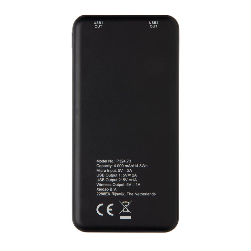 Diese ultradünne 4.000 mAh Powerbank mit einer A-Grade Lithium-Polymer Batterie lädt Ihr Smartphone herkömmlich per USB-Port oder als 5W Wireless Charger. Das Gehäuse aus ABS, die LED's zeigen Ihnen den Ladestand der Powerbank an. Micro USB Port in: 5V/2A. Output: 5V/2A. Wireless Output: 5W; 5V/1A