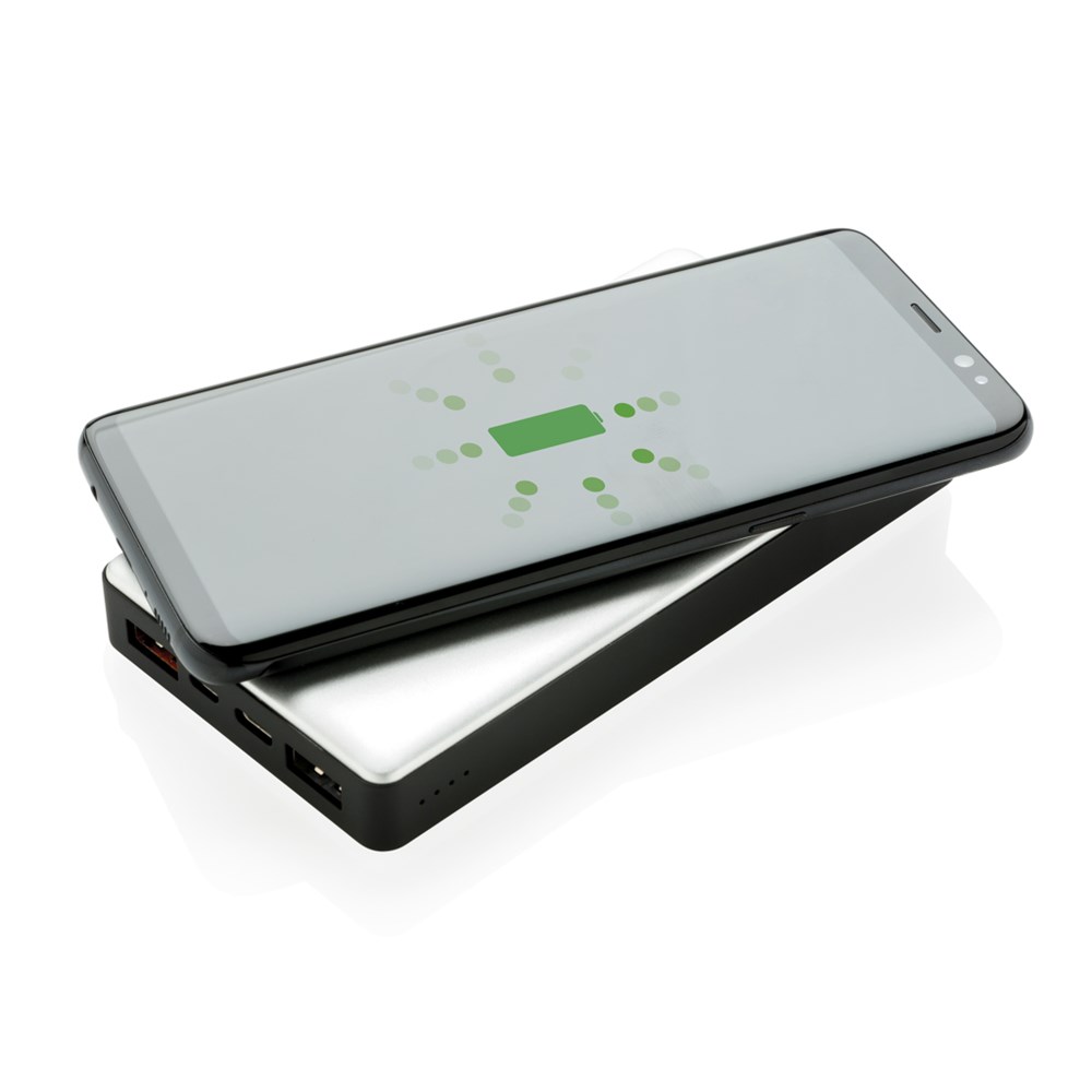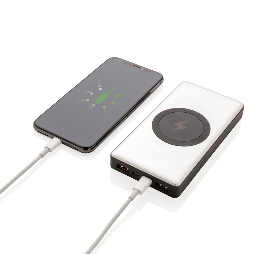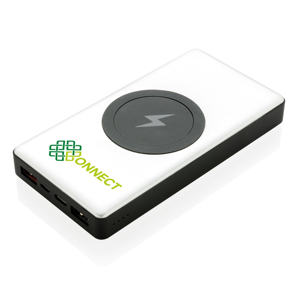 Diese Powerbank aus Aluminium vereint alle modernen Techniken in einem Gerät. Ein 10W Wireless-Charger für QI-fähigen Geräte – Androids der neusten Generation, sowie iPhone 8 und höher. Ebenso hat diese Powerbank 3 Ausgangs-Ports: ein Quick-Charge 3.0 Port, einen normalen USB Port und einen Type C Power-Delivery Ausgangsport für z.B. Smartphone, Macbook(max 18W) oder Nintendo Switch. Der Power-Delivery Port lädt Ihr iPhone 8 in unter einer Stunde vollständig auf. Input über Micro-USB max. 2A, über Type C max. 3A; Output QC Port und Type-C: 5V/3A; 9V/2A; 12V/1.5A – Wireless Output: 5V/1A; 9V/1.1A.