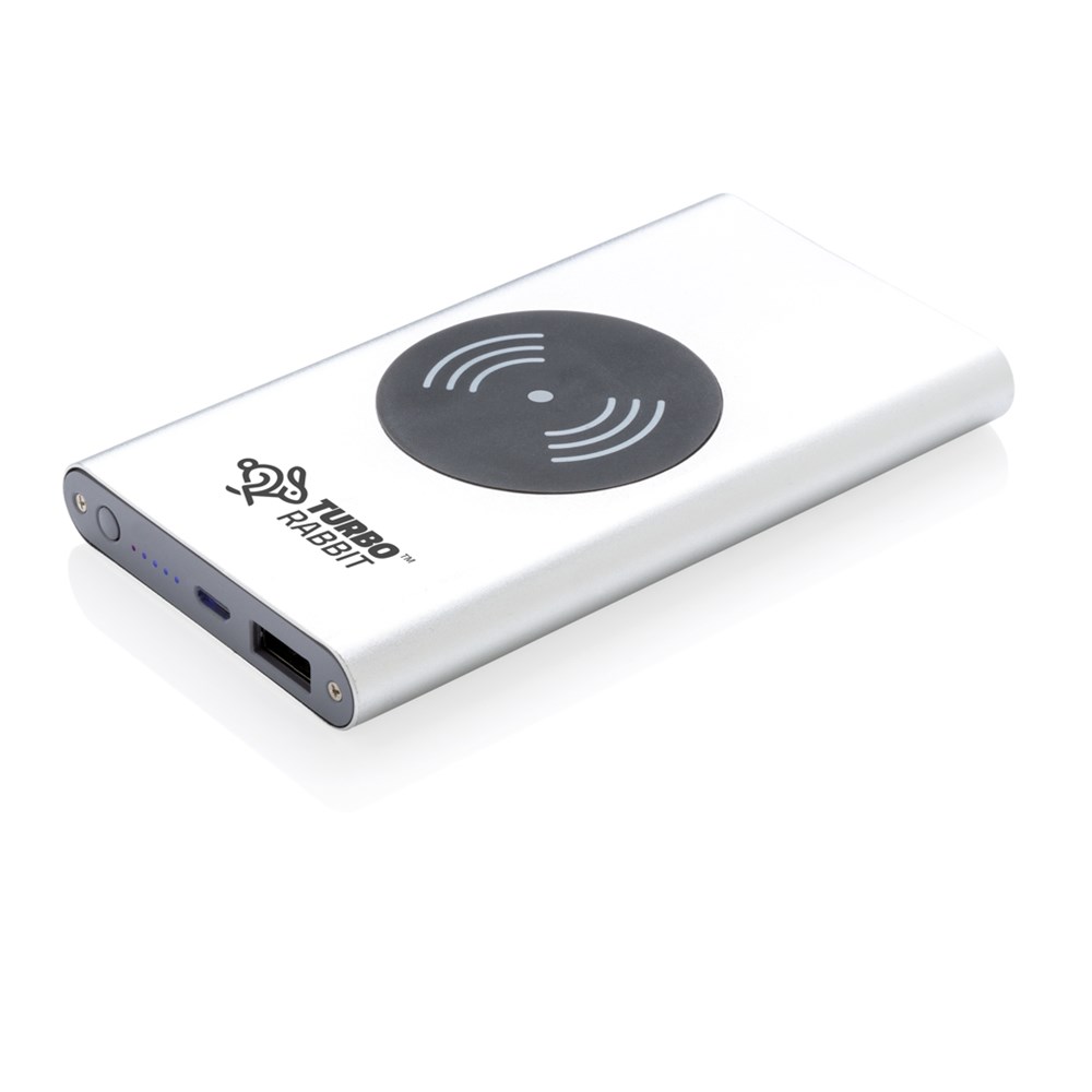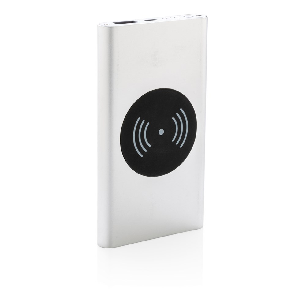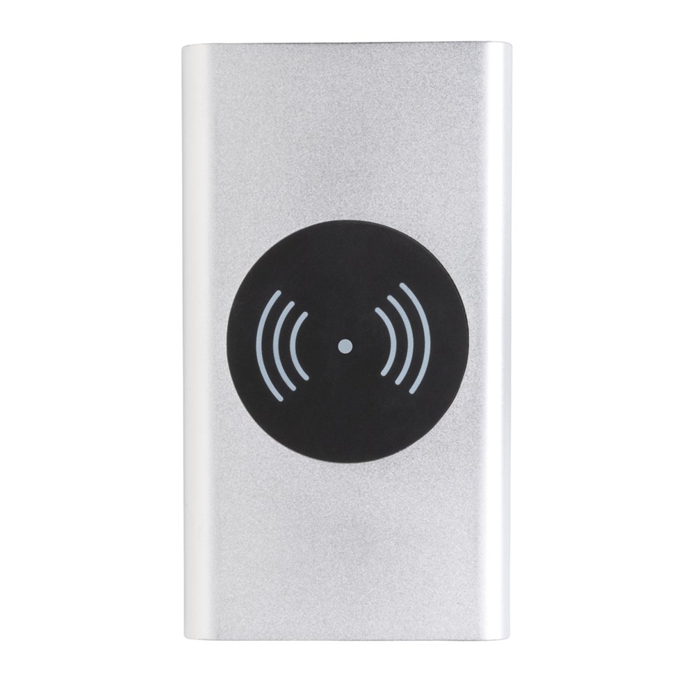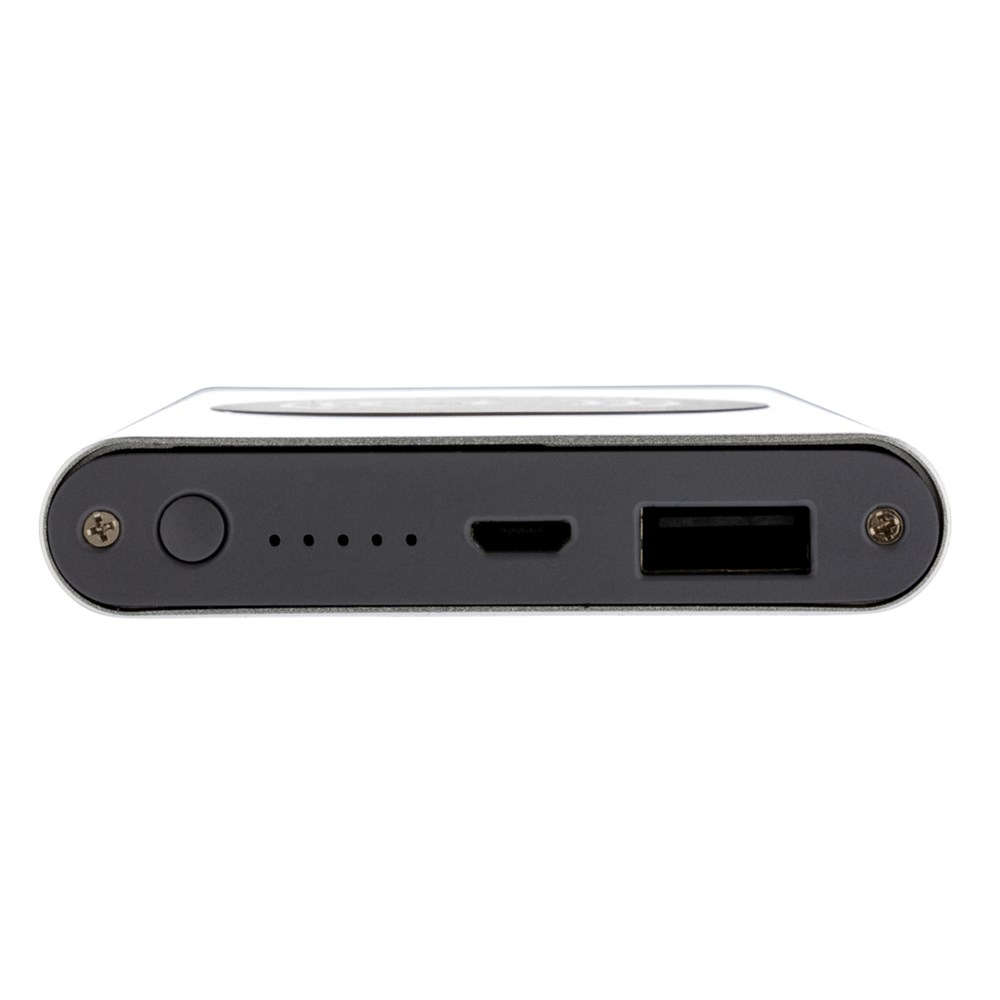 4.000 mAh Powerbank mit Hochleistungs-Lithium-Polymer-Batterie und integriertem 5W kabellosem Ladergerät. Mit An-/Ausschaltknopf und Batteriestandsanzeige. Output 5V/2,1; Input 5V/1,5A; Kabelloser Output: 5W.