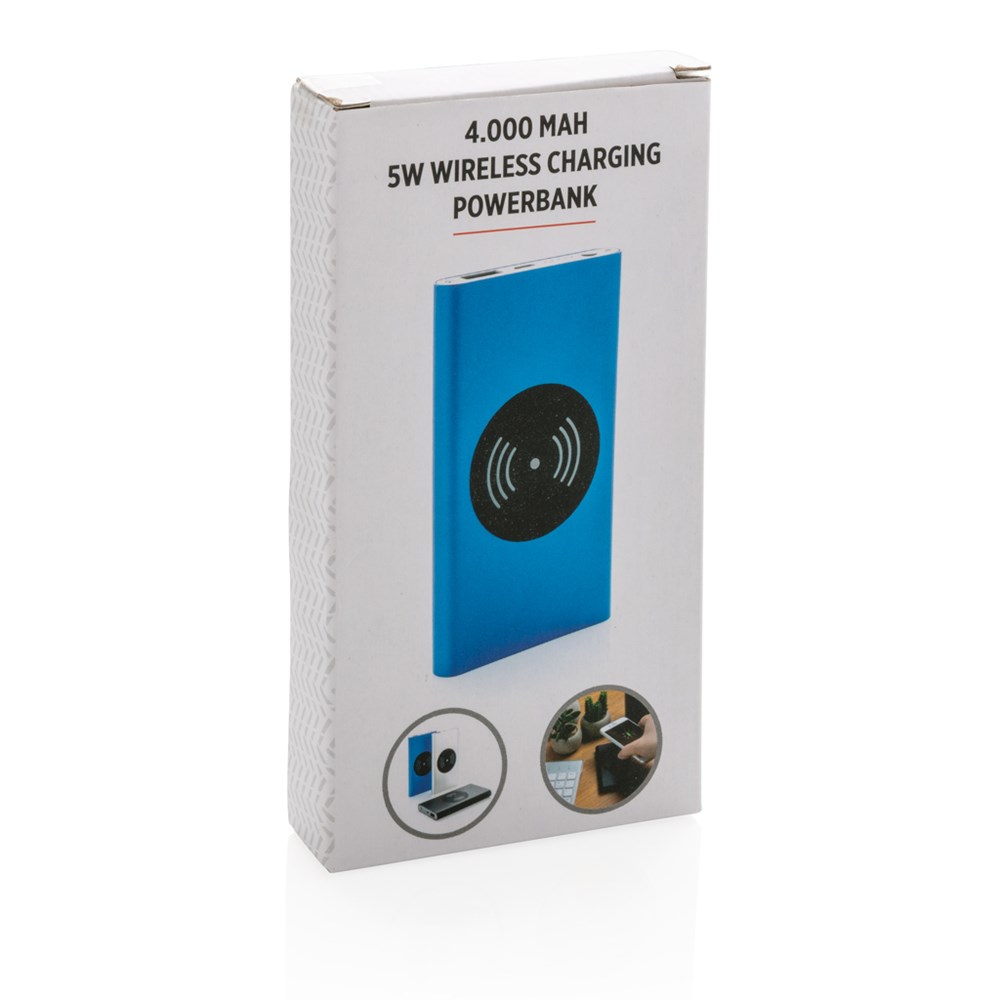 4.000 mAh Powerbank mit Hochleistungs-Lithium-Polymer-Batterie und integriertem 5W kabellosem Ladergerät. Mit An-/Ausschaltknopf und Batteriestandsanzeige. Output 5V/2,1; Input 5V/1,5A; Kabelloser Output: 5W.
