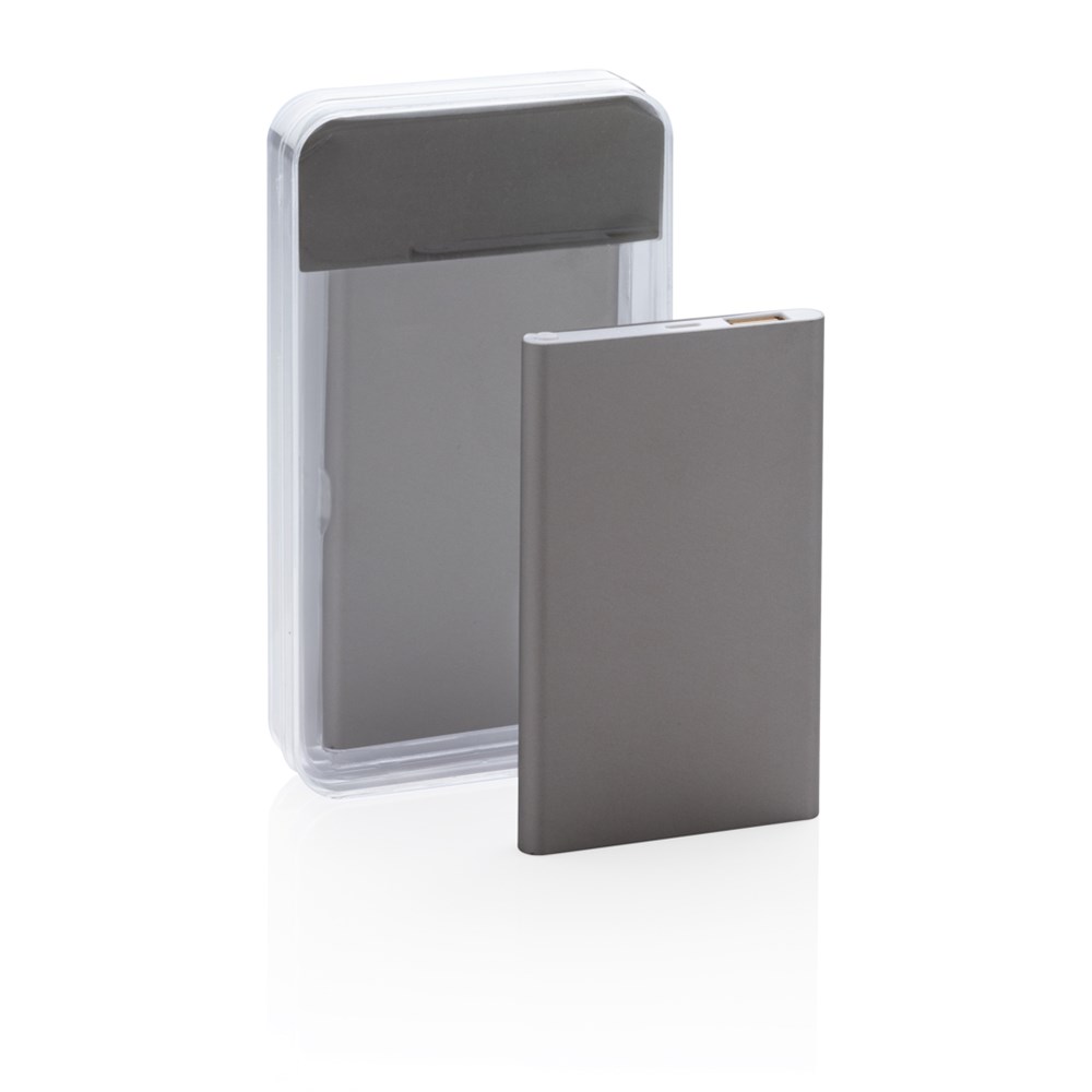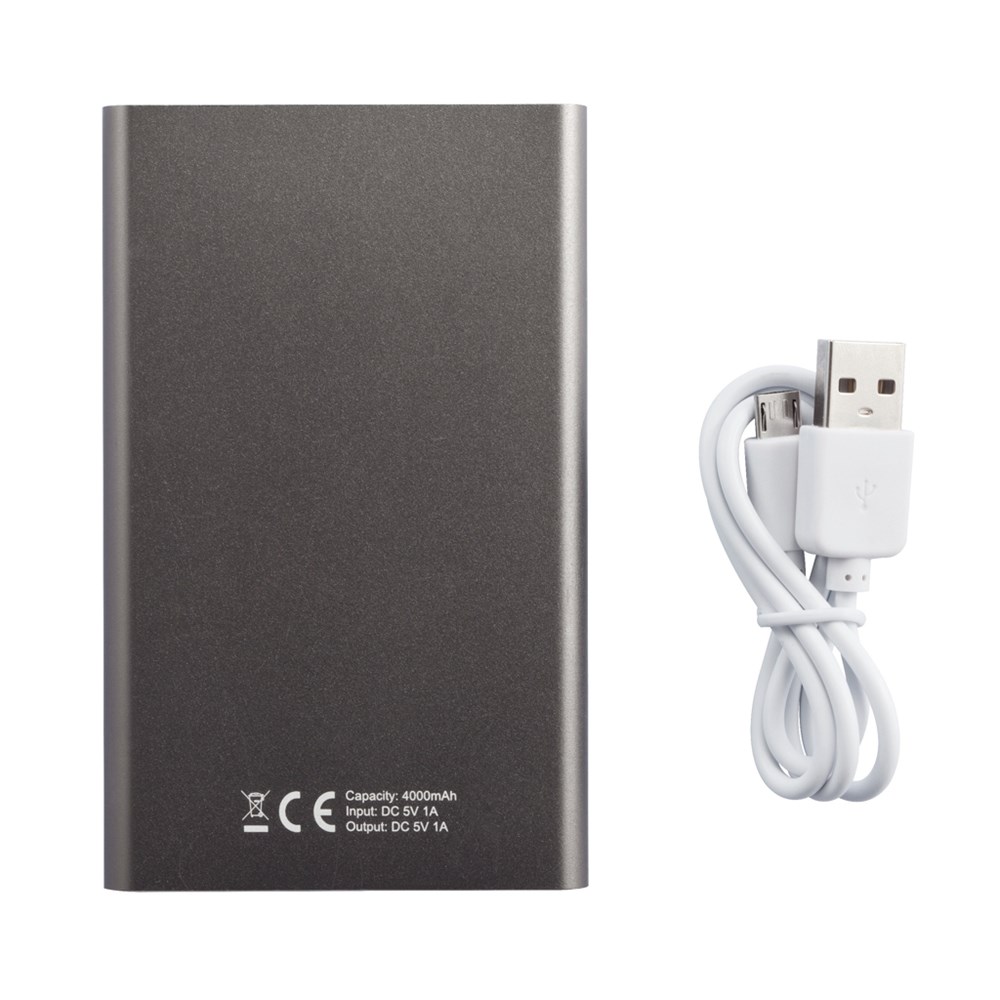 Flache 4.000 mAh Powerbank aus Aluminium mit hochwertiger Lithium-Polymer-Batterie. Mit An/Aus-Knopf und Indikator zur Anzeige der verbleibenden Energie. Konfektioniert in transparenter Geschenkbox. Output 5V/1A, Input 5V/1 A. Lieferung inkl. Micro-USB Kabel.