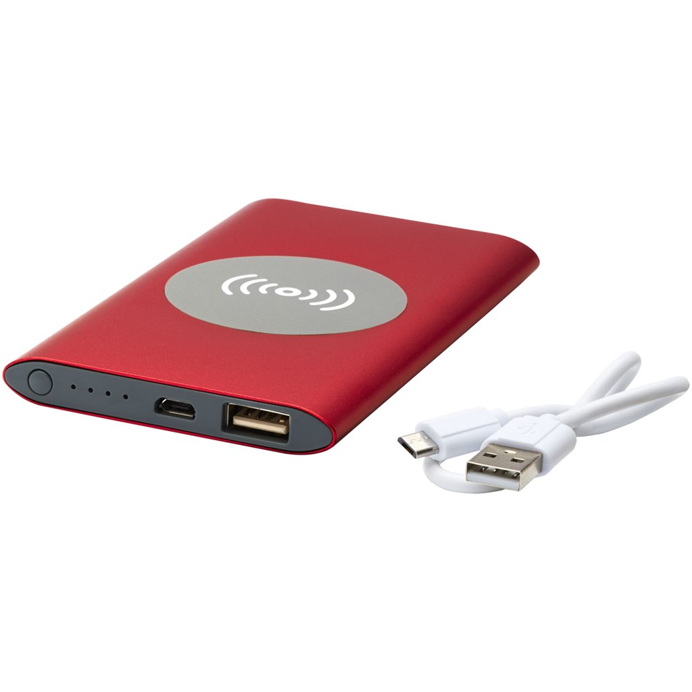 4000 mAh Powerbank mit Aluminiumgehäuse. Unterstützt kabelloses Laden mit 5 W und wird auch mit Mikro-USB-Ausgang geliefert, um das Aufladen per Kabel zu ermöglichen. Mit dem 4000 mAh Lithium-Polymer-Akku kann ein Smartphone vollständig aufgeladen werden. Leistungsanzeige, die jederzeit den Energiepegel anzeigt. Mikro-USB-Anschluss: 5 V/2 A Ausgang: 5 V/2A. Kabelloser Ausgang 5 W. Inklusive PVC-freiem TPE Kunststoff Ladekabel. Lieferung in einer Standard-Geschenkbox.