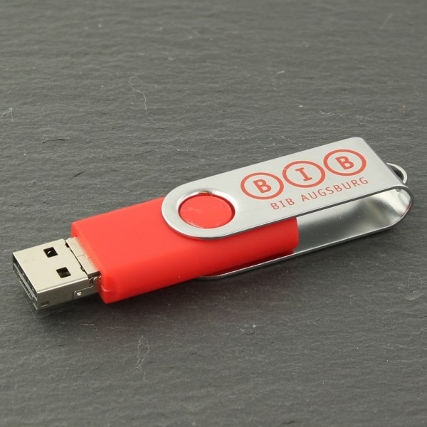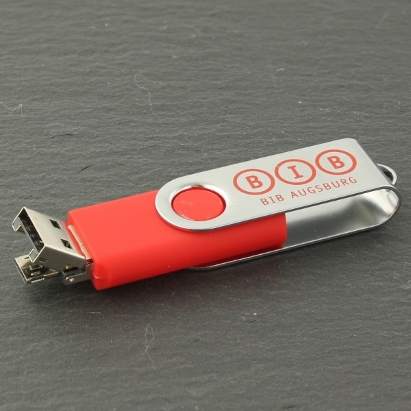 Größe (L x B x H): 57 x 20 x 12 mm, Gewicht: 15 g, mögliche Veredelungsbereiche: Vorderseite Flügel, Größe 26 x 14 mm, Rückseite Flügel, Einfärben Kunststoff ab 100 Stück, Einfärben Metall ab 100 Stück, Hinweis: 2 in 1 Duo Stick A auf USB Micro