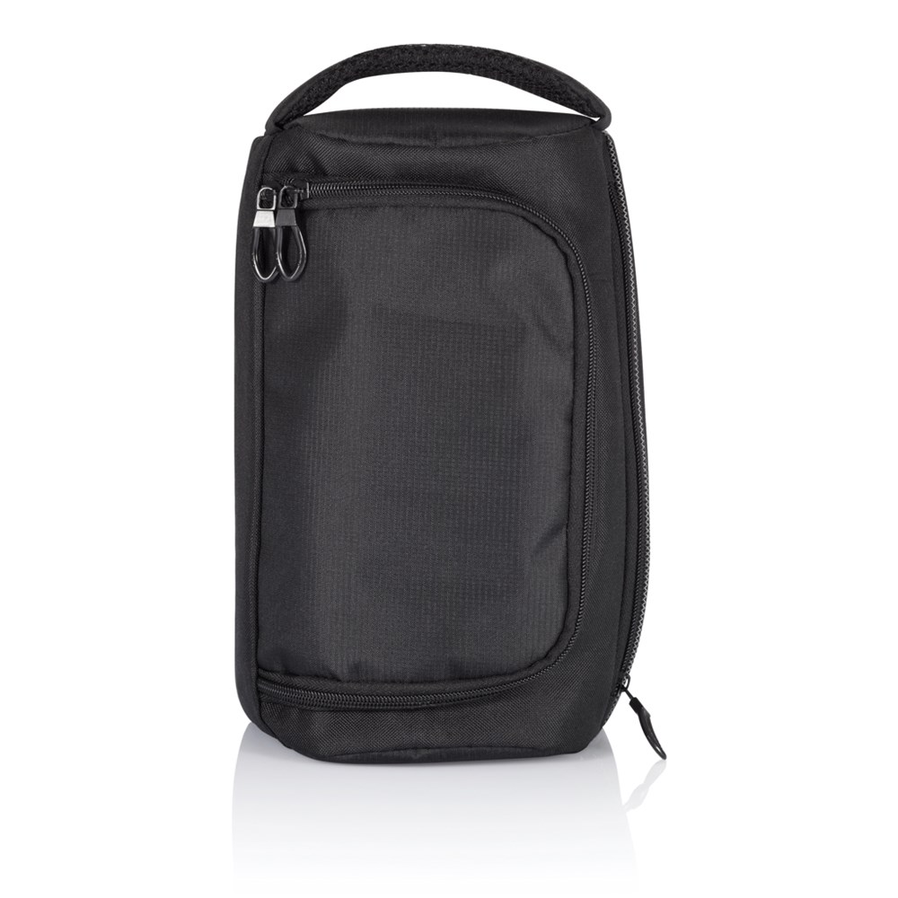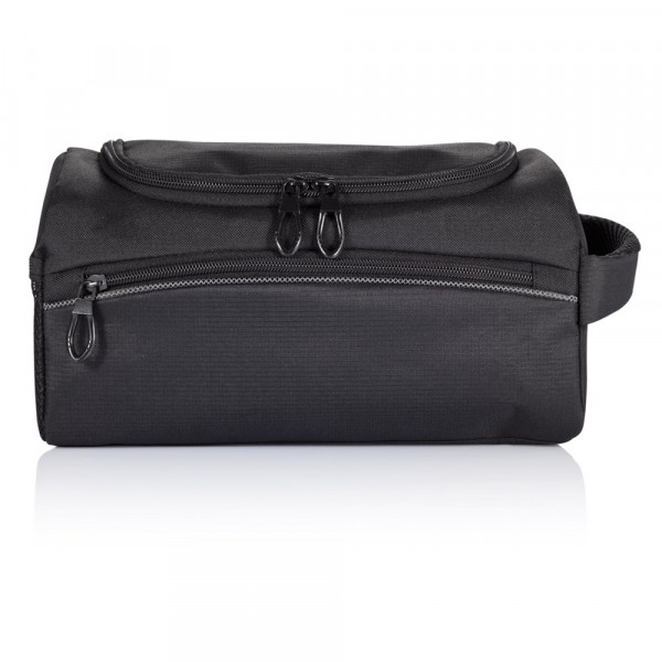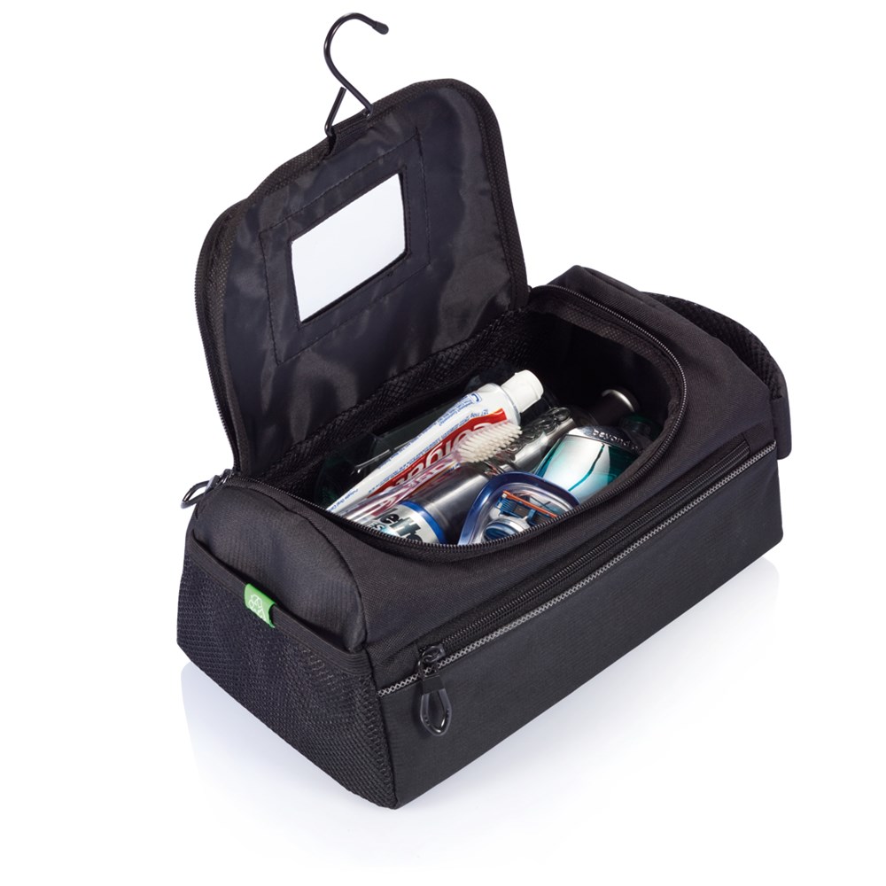 600D Ripstop, Haupt- und Frontfach, Metallhaken, Spiegel, Netztasche innen und außen links, PVC-frei.