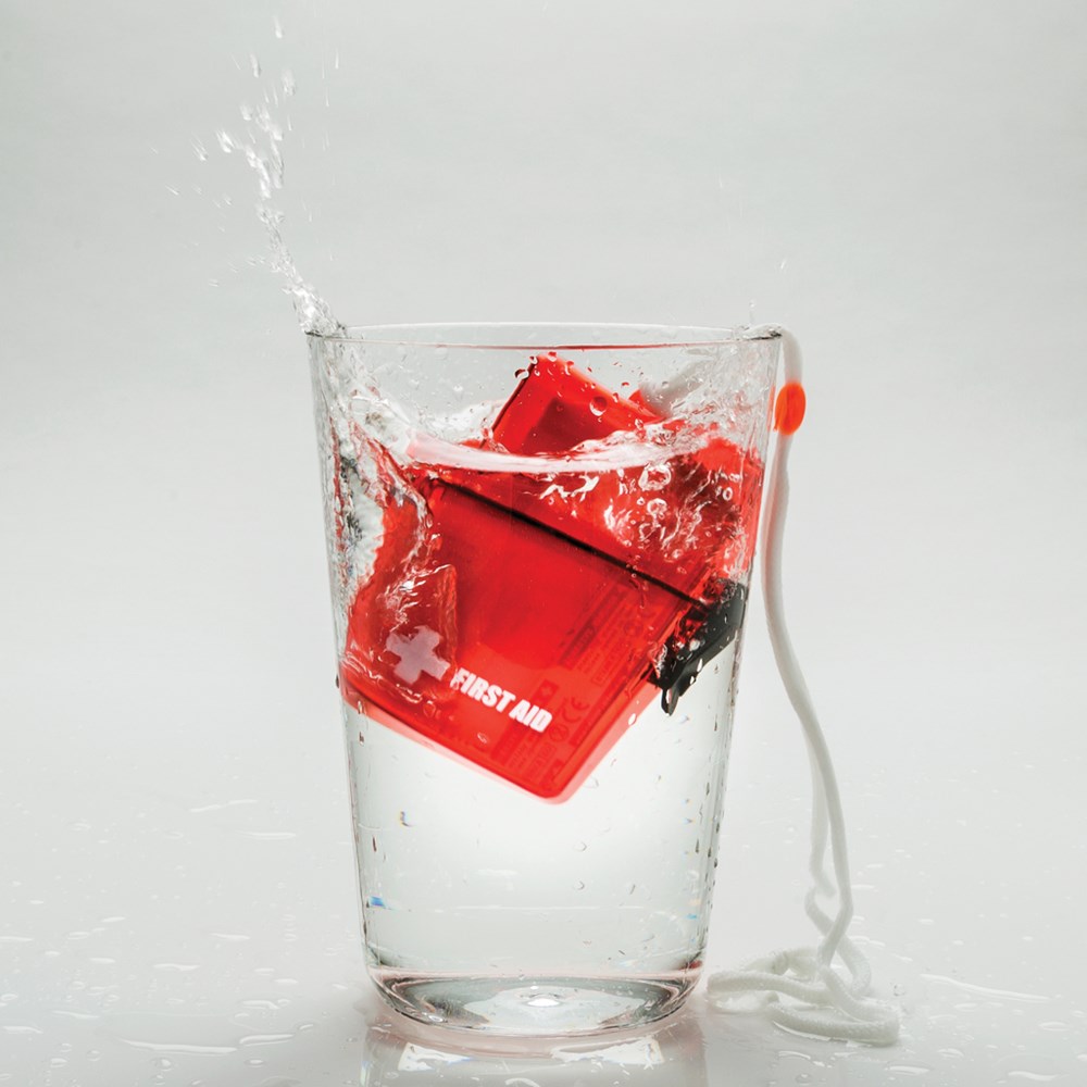 Erste Hilfe Set mit 5 Pflastern, 2 Alkoholtupfern, NonWoven Schwamm und 2 Feuchttüchern. Verpackt in einer spritzwassergeschützten Kunststoffbox.