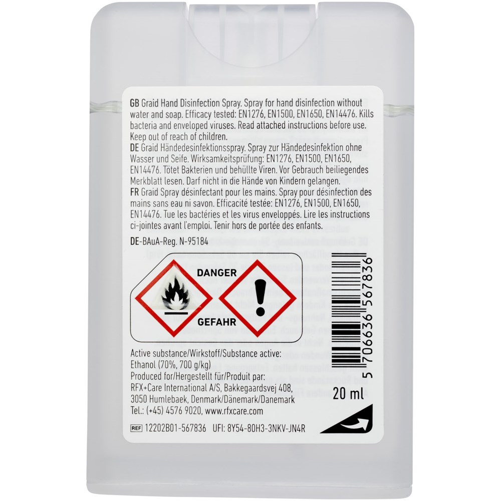 Desinfiziert die Hände ohne den Einsatz von Wasser und Seife. Flachbehälter für Unterwegs mit Sprühfunktion mit desinfizierendem hydroalkoholischem Handspray, das vor Bakterien und umhüllten Viren schützt. Eine kleine Menge auf die Hand auftragen und mit einer Waschbewegung verteilen. Innerhalb von Sekunden sind die Hände trocken. Enthält 70 % Alkohol, der desinfizierend wirkt und das Produkt nach der Anwendung schnell trocknen lässt. Zugelassen und geregelt nach Biozid-Verordnung (EU) 528/2012. Wirksamkeit geprüft: EN1276, EN1500, EN1650, EN14476. Tötet Bakterien und umhüllte Viren.